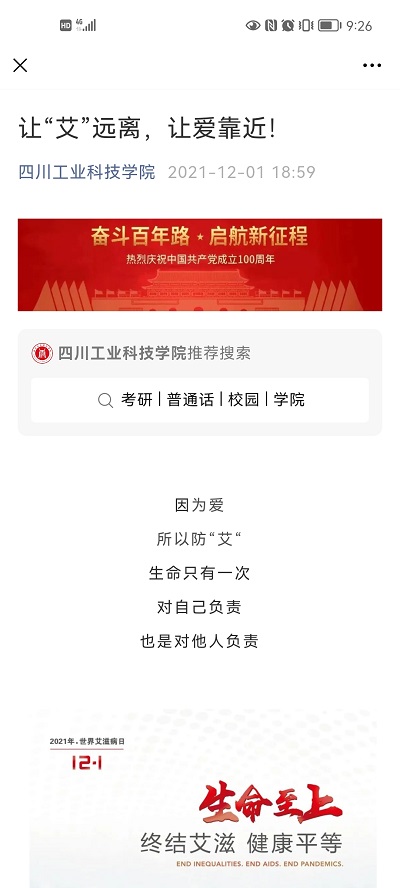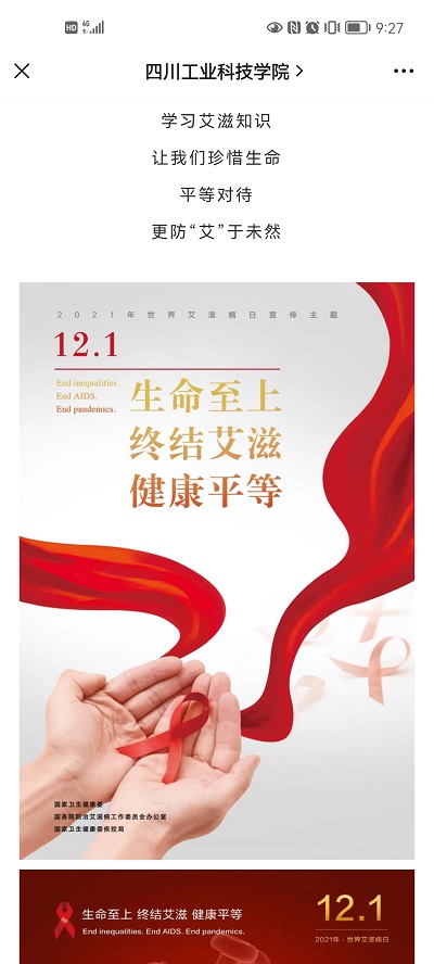 34个世界艾滋病日,宣传教育活动主题为“生命至上 终结艾滋 健康平等”。按照上级部门有关要求,立足于我校自身特点,积极行动起来,找准工作重心,加强防艾宣传,广泛