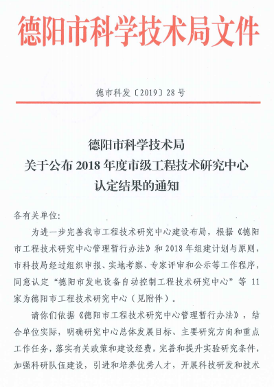 2019年5月7日,德阳市科学技术局公布了2018年度市级工程技术研究中心认定结果,我校首个依托智能制造与车辆工程学院,由天浪新能源科研团队负责的“新能源专用车辆工程技术研究中心”正式通过认定。这标志着我校科研工作取得了一项阶段性新成果,学校科研工作构建了一个更高层次新平台。