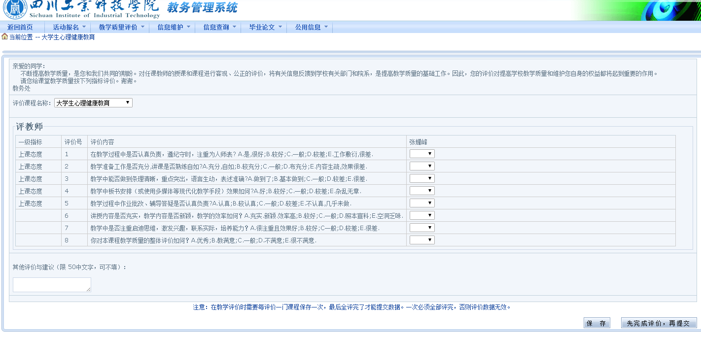 6、点击“教学质量评价”一栏,进行评价,显示如下: