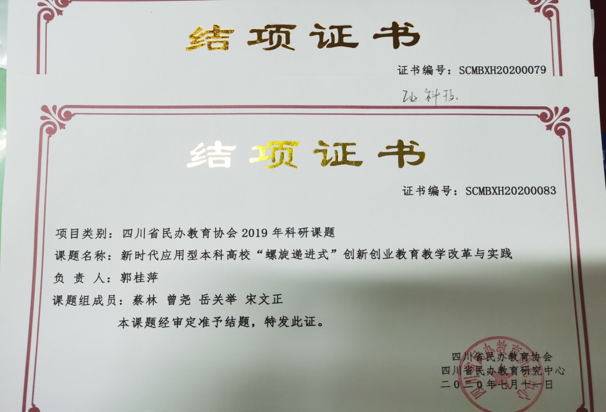 办教育协会高等教育专业委员会、四川省民办教育协会研究中心共同牵头组织的四川省民办高校内涵建设项目的评选,我校所推荐2项教学成果奖和2项科研成果奖参选项目,均获得评审专家的认可,填补了我校教学成果奖和科研成果奖在省级项目上的空白。