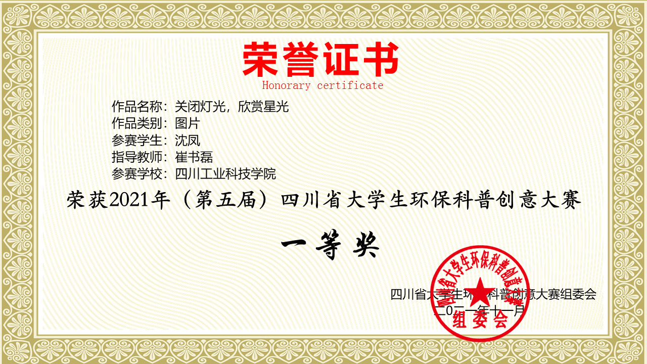 11月6日,由中国环境科学学会、四川省生态环境厅、四川省科学技术协会指导,四川省教育厅主办,西华师范大学、四川省环境科学学会承办的2021(第五届)四川省大学生环保科普创意大赛在西华师范大学落下帷幕。大赛共有48所高校参赛,我校6个作品进入决赛并分别获得1项一等奖、2项二等奖和3项三等奖,崔书磊老师荣获优秀指导老师。