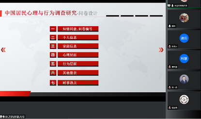 为进一步促进中国居民心理与行为调查研究(China psychology and behavior study,CPBS)问卷内容合理性和科学性,更好的吸取各位专家老师的意见。4月25日下午,中国居民心理与行为调查研究负责人吴一波研究员邀请德阳市哲学社会科学重点研究基地心理与行为研究中心负责人,我校马克思主义学院蔡林及其研究团队进行线上研讨。会议由吴一波主持。