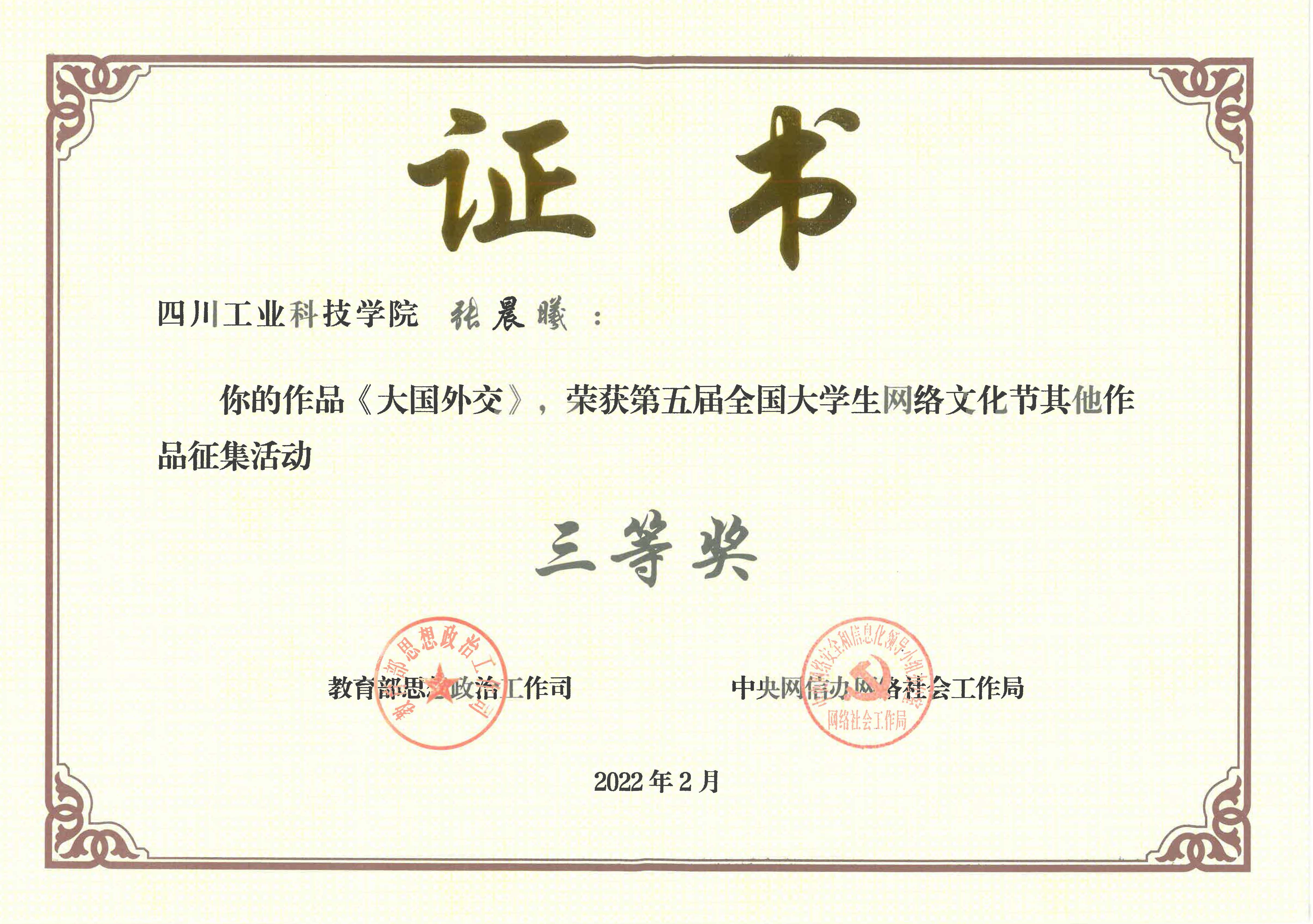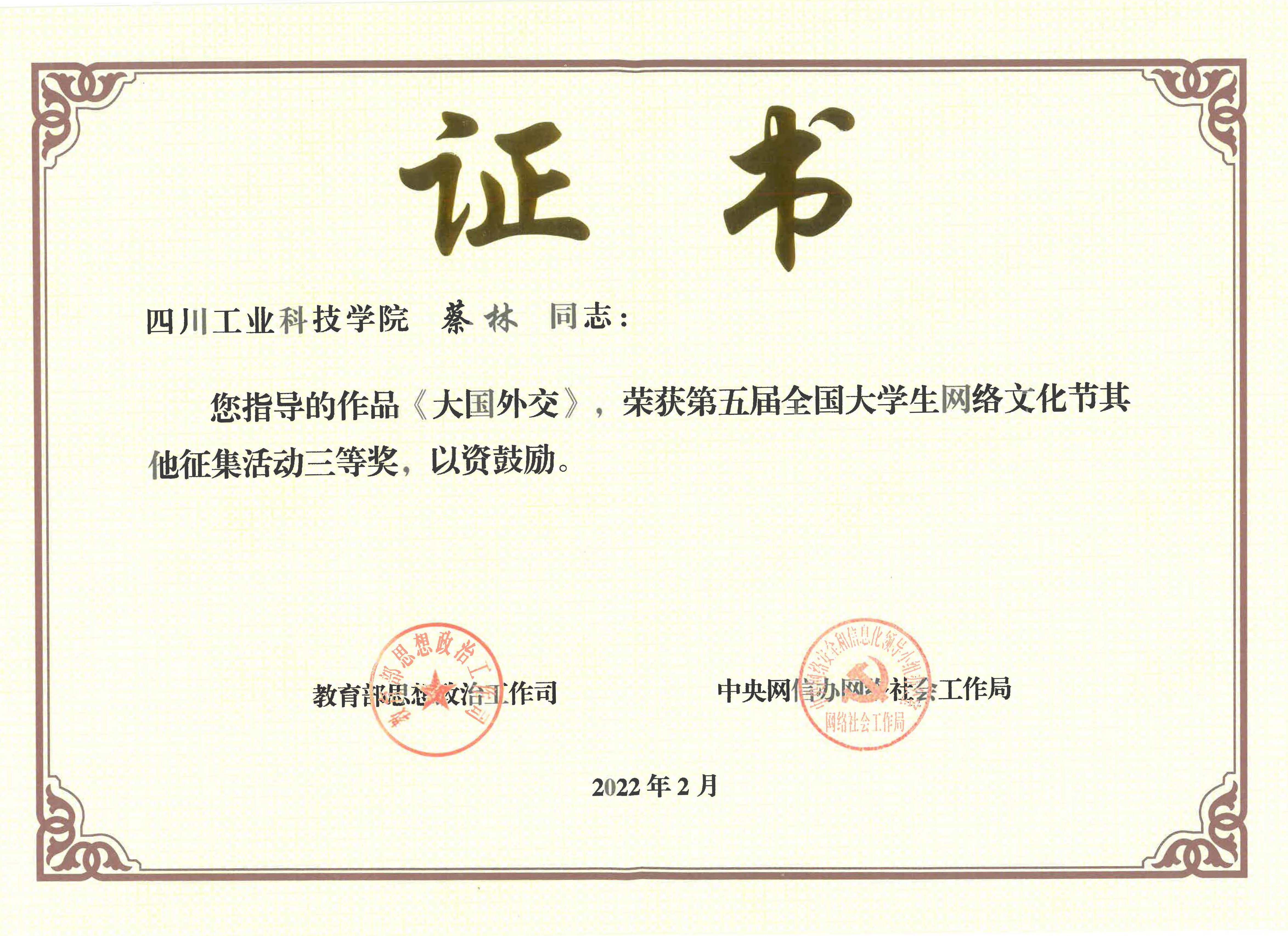 根据《教育部思想政治工作司 中央网信办网络社会工作局关于举办第五届全国大学生网络文化节和全国高校网络教育优秀作品推选展示活动的通知》工作安排,经作品申报、资格审核、专家审议、结果公示等程序,遴选产生了第五届“全国大学生网络文化节”和“全国高校网络教育优秀作品推选展示活动”入选名单,我校马克思主义学院蔡林副教授指导我校学生张晨曦完成的作品《大国外交》获第五届“全国大学生网络文化节”三等奖。这是继我校师生2021年荣获第四届“全国大学生网络文化节”优秀奖之后再传捷报。