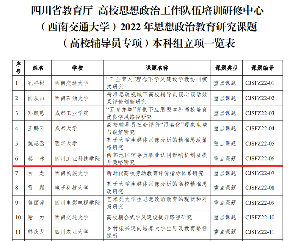 近日,我校马克思主义学院党总支副书记、副院长蔡林副教授主持的课题“西部地区辅导员职业认同影响机制及提升策略研究”获批四川省教育厅与高校思想政治工作队伍培训研修中心(西南交通大学)联合设立的思想政治教育研究课题重点项目。
