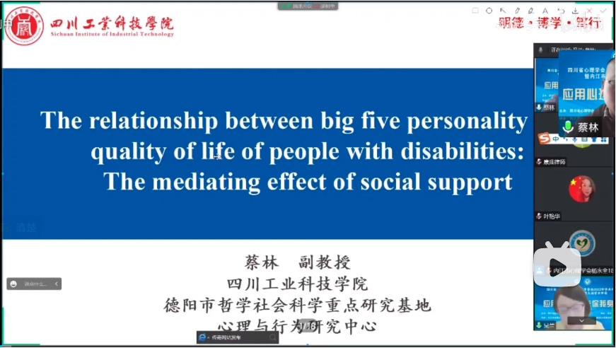在专题报告中,我校蔡林副教授以“The relationship between big five personality and quality of life of people with disabilities: The mediating effect of social support”为题,汇报了与北京大学吴一波博士、天津师范大学贾绪计博士以及我校本科生何佳欣共同完成的学术论文。蔡林从研究背景、理论基础和研究、材料和方法、结果与讨论四个方面进行了全面汇报,得到与会专家的一致好评。