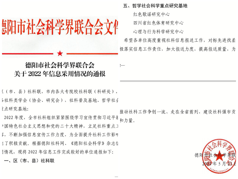 5月23日,德阳市社会科学界联合会通报了2022年信息采用情况,我院红色歌谣研究中心和心理与行为科学研究中心受表扬通报。