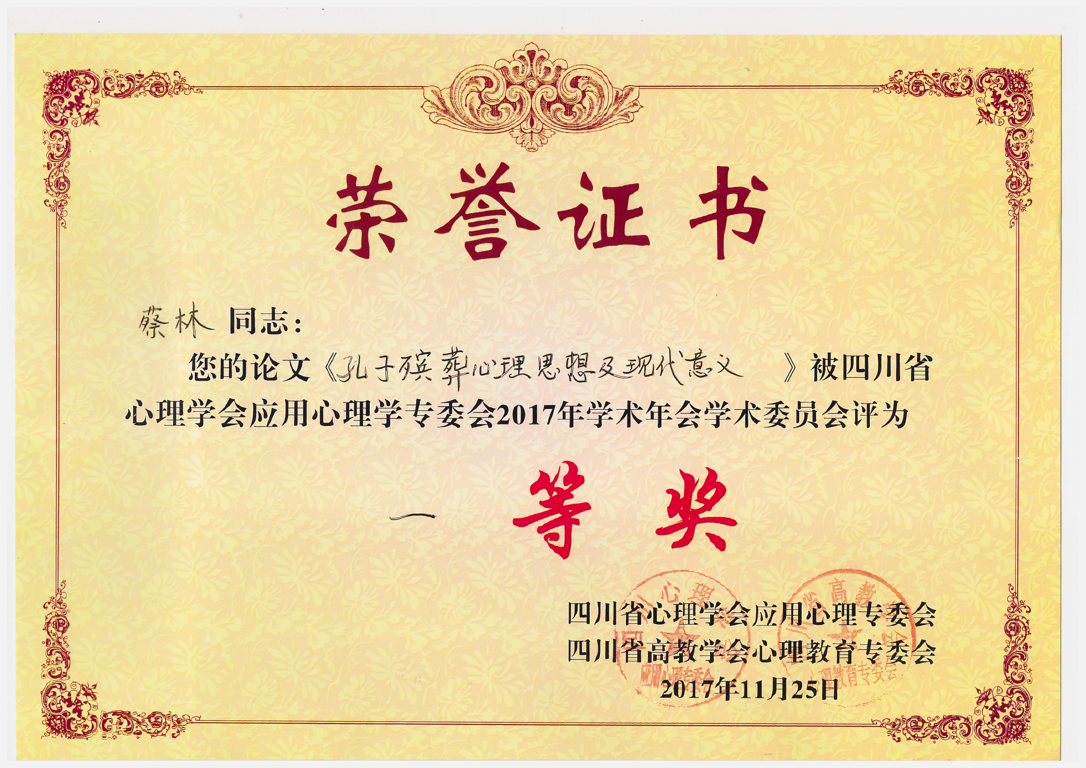 思政部的蔡林老师《孔子殡葬心理思想及现代意义》获得四川省心理学会应用心理学专委会2017年学术年会评委会一等奖。