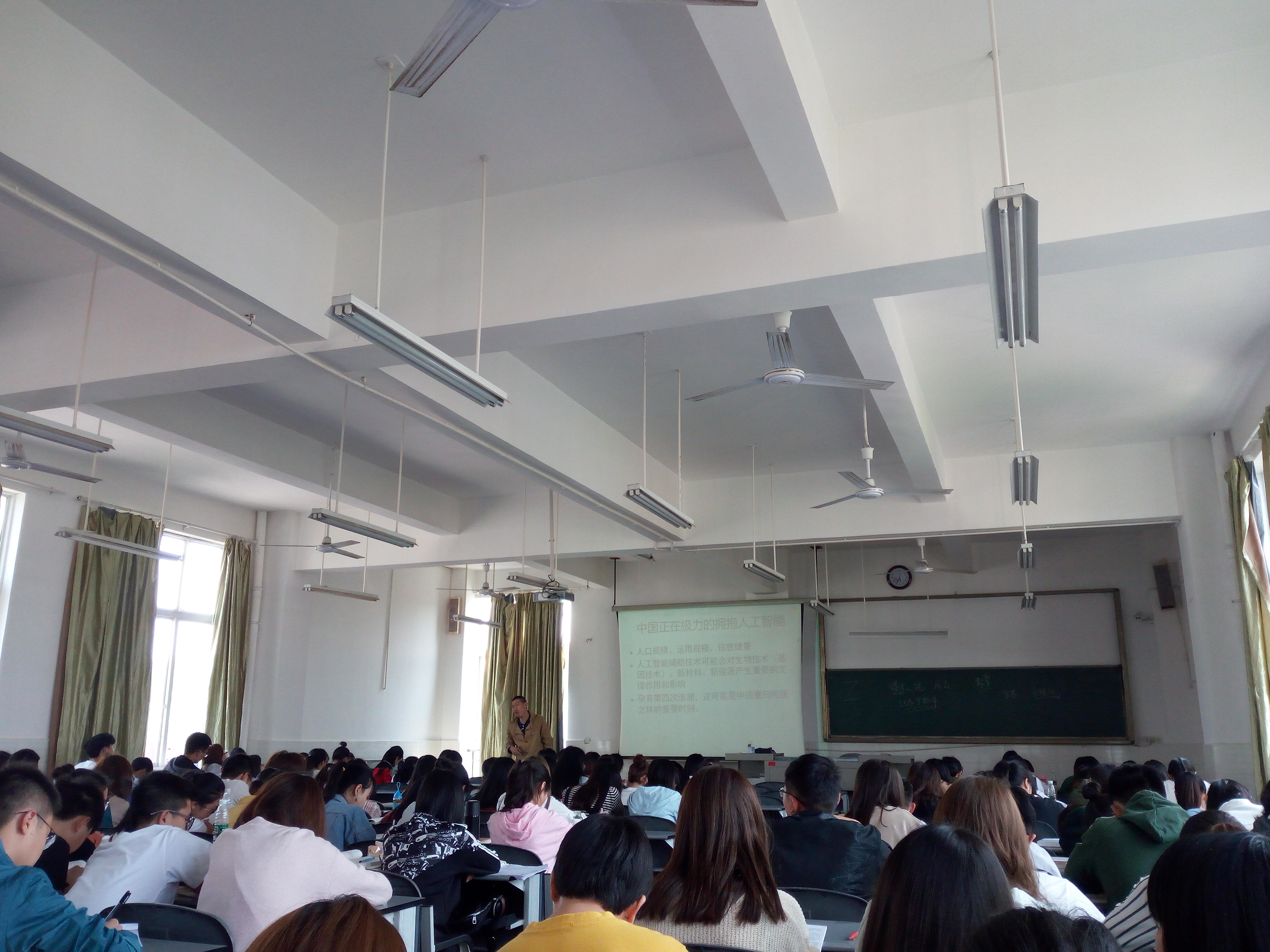 4月16号在7-401,郑江华老师讲了一次专题“十九大怎么看”,首先郑老师把十九大与以往十八大做了一个比较,然后把十九大和大学生感兴趣新媒体有机进行结合,拉近了学生对十九大距离,最后给学生推荐书籍《千年终结》。让学生在十九大精神指示下,好好学习,放飞理想。