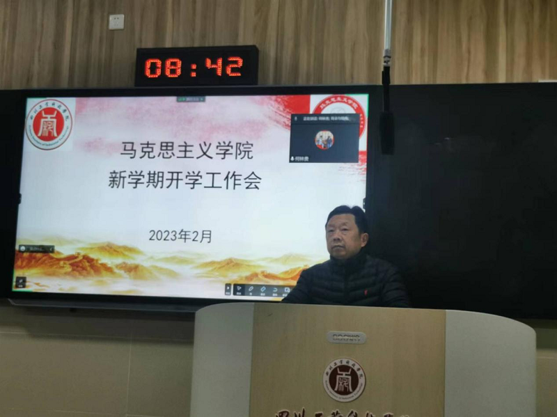 蔡林副院长汇报2023年主要工作计划和意识形态安全工作,鼓励大家学习贯彻好二十大精神,强抓教育教学质量,并向全体老师宣读拟定的《马克思主义学院意识形态安全责任制实施办法》。