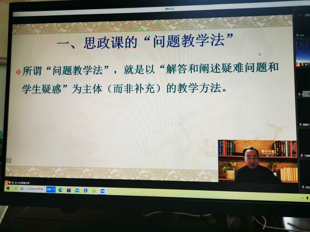 本次培训持续三个小时,冯老师的演说贴近现实,举例丰富,让全体思政教师进一步明白课堂中应该讲什么,怎么讲,以及为什么要这么讲。