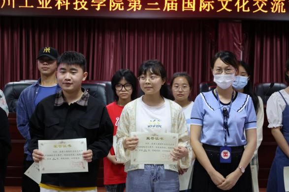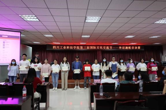 决赛阶段。活动组织有序,稳步推进。4月25日大赛组委以线上线下同步进行的方式,进行了决赛前的人员分工协调会,确定了主持人、记分员、场地负责人、设备负责人、摄影师、后勤保障小分队、证书制作负责人、评委及特邀嘉宾邀约负责人等。4月26日晚18:30-21:00在图书馆D08进行了现场彩排,选手和主持人分别进行了场地及设备熟悉,并进行了多次反复的彩排。4月27日下午17:00到梦空间发布观赛通道,因疫情原因,现场人数控制在了50人,观众报名踊跃。4月28日晚18:40观众和评委有序进场。决赛于当晚 19:00在图书馆D08正式开始。通过紧张而激烈的角逐,最后产生一等奖1名、二等奖2名、三等奖3名、优秀奖14名。20级商务英语01班罗雪梅的英语作品《后妈茶话会》、21级法律事务01班李浩论的英语作品《破产姐妹&午夜阳光》、20物流管理01班余欢的日语作品《日语混剪》、21级食品安全01班李彬彬的英语歌曲《Free loop》因表现突出,成绩优异分别位列前四强。出席本次活动评委的国合处邓洪部长、基础课教学部许敏主任等评委分别为他们进行了颁奖并留影。