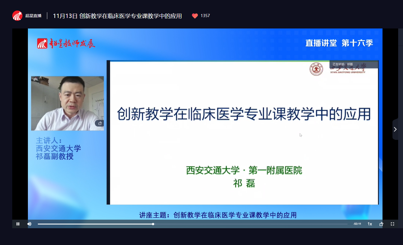 本期直播讲堂特邀西安交通大学第一附属医院教学部副部长祁磊副教授担任主讲嘉宾。祁磊为与会教师带来了一场题为《创新教学在临床医学专业课教学中的应用》的学术报告。报告中,祁磊结合自身深厚的临床背景与丰富的教学管理经验,深入剖析了当前临床医学专业课程教学面临的挑战与机遇。他重点分享了如何将案例教学法(CBL)、问题导向学习(PBL)、模拟教学、翻转课堂等创新教学方法有机融入临床医学专业课的教学实践,并通过生动的实际教学案例,详细阐述了这些方法在激发学生学习主动性、培养临床思维与实践能力、提升教学效果等方面的具体应用策略与显著成效。祁磊表示,面对医学教育的快速发展和人才培养的新要求,教师需主动求变,积极探索并实践以学生为中心的教学模式,将前沿医学知识、临床技能与人文素养培育深度融合,有效提升医学人才的培养质量。