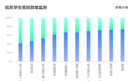 全校上周学生整体签到率为82.01%,具体各院系情况如下,请各教学单位提高学生签到率。