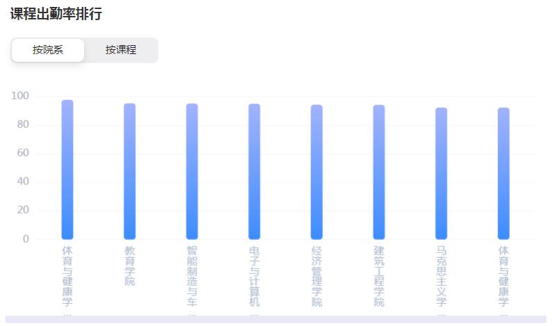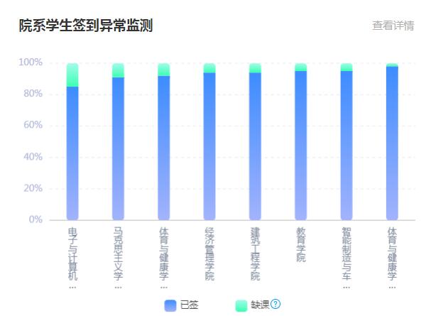 上周全校学生课堂签到率为93.33%,环比上周略微下滑。具体分布如下: