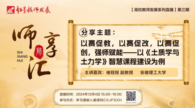 今日15:00-16:00超星教师发展中心推出【师享汇】系列线上公益直播讲座第三期,特邀安徽理工大学褚程程副教授以《土质学与土力学》智慧课程建设为例,分享以赛促教,以赛促改,以赛促创,强师赋能经验。