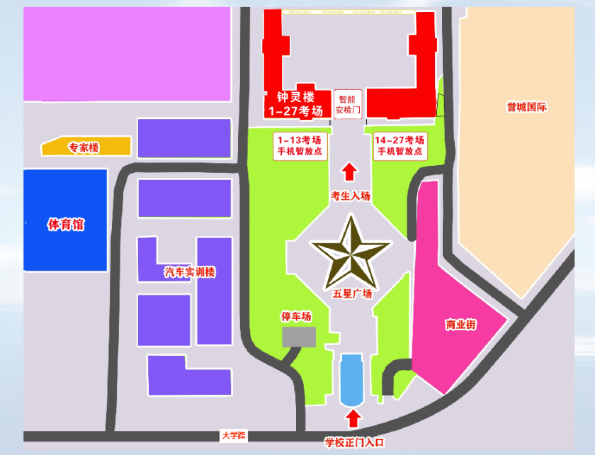 提示:我报考点(封闭区域)入口处设置有物品集中统一放置区域,请按要求,将不得携带的物品放置在集中统一放置区域,自查无误后有序排队接受安检。