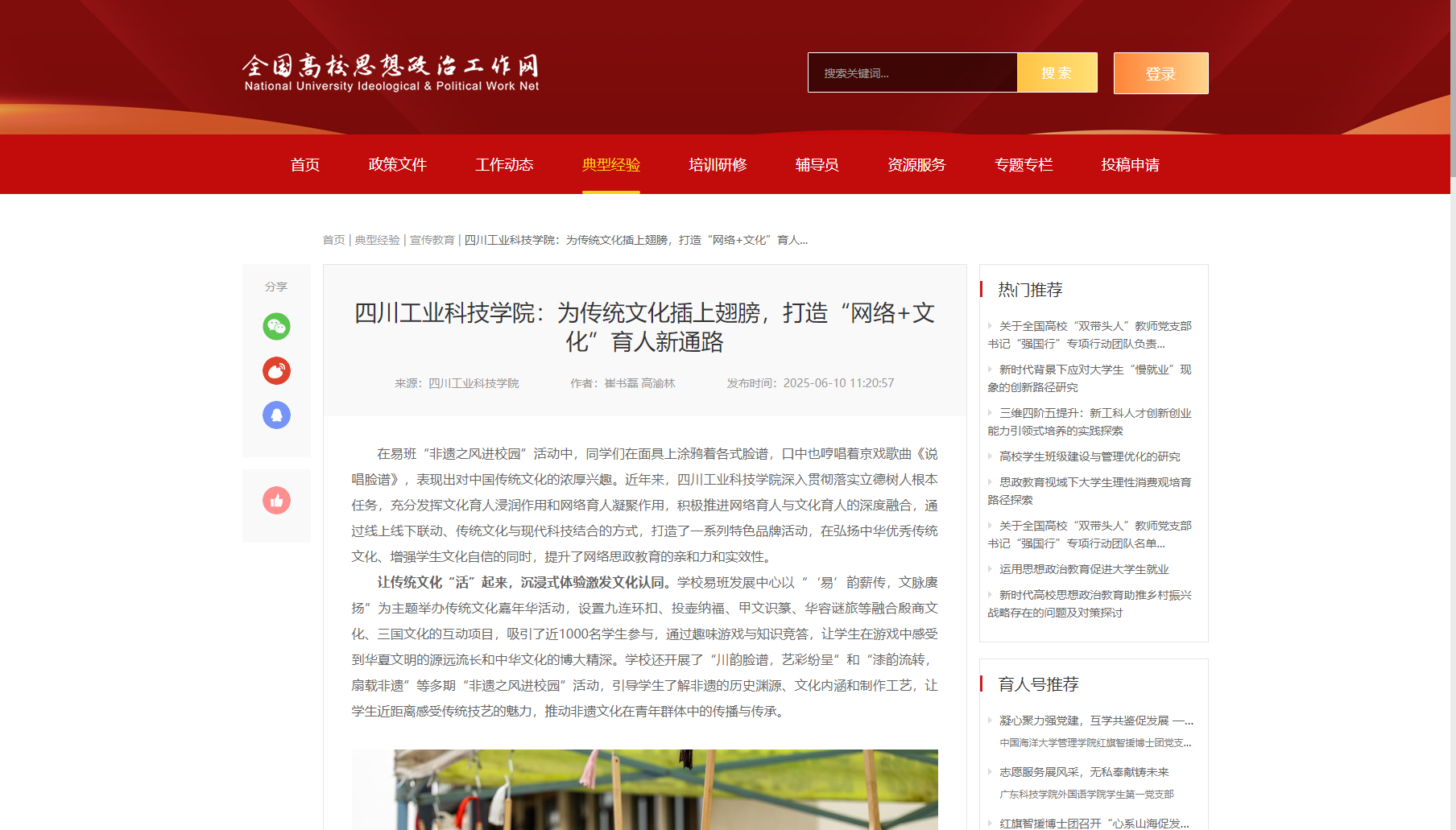 让网络思政“动”起来,线上线下融合拓宽育人阵地。学校充分发挥网络思政平台优势,依托易班优课平台开展“传承非遗文化,弘扬民族精神”60天主题宣传活动,形式包括微课学习、线上打卡、知识竞赛等,累计覆盖3000余名学生。同时,结合“网络中国节”系列活动,在春节、清明节、端午节等传统节日期间,推出主题推文、短视频、线上互动等丰富内容,引导学生云端过节、感悟文化内涵。学校还定期组织网络思政学生骨干前往罗江庞统祠、李调元纪念馆等开展研学活动,通过实地走访与新媒体传播相结合的方式,挖掘地方文化资源,提升思政教育的感染力。