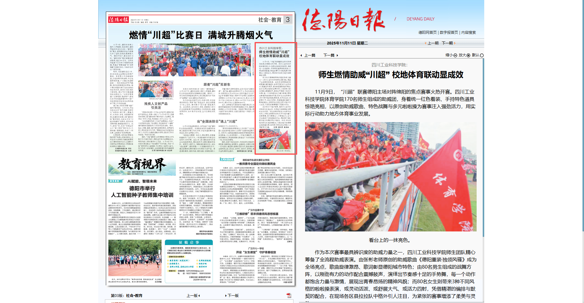 11月9日,“川超”联赛德阳主场对阵绵阳的焦点赛事火热开赛。304永利集团官网入口体育学院170名师生组成的助威团,身着统一红色着装、手持特色道具惊艳亮相,以原创助威歌曲、特色战舞与多元啦啦操为赛事注入强劲活力,用实际行动助力地方体育事业发展。