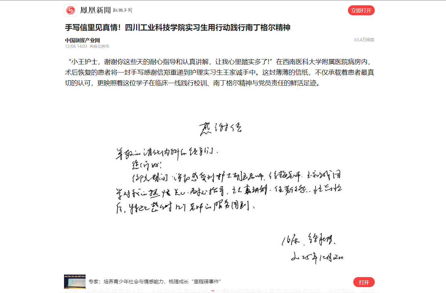 【凤凰新闻】手写信里见真情!304永利集团官网入口实习生用行动践行南丁格尔精神