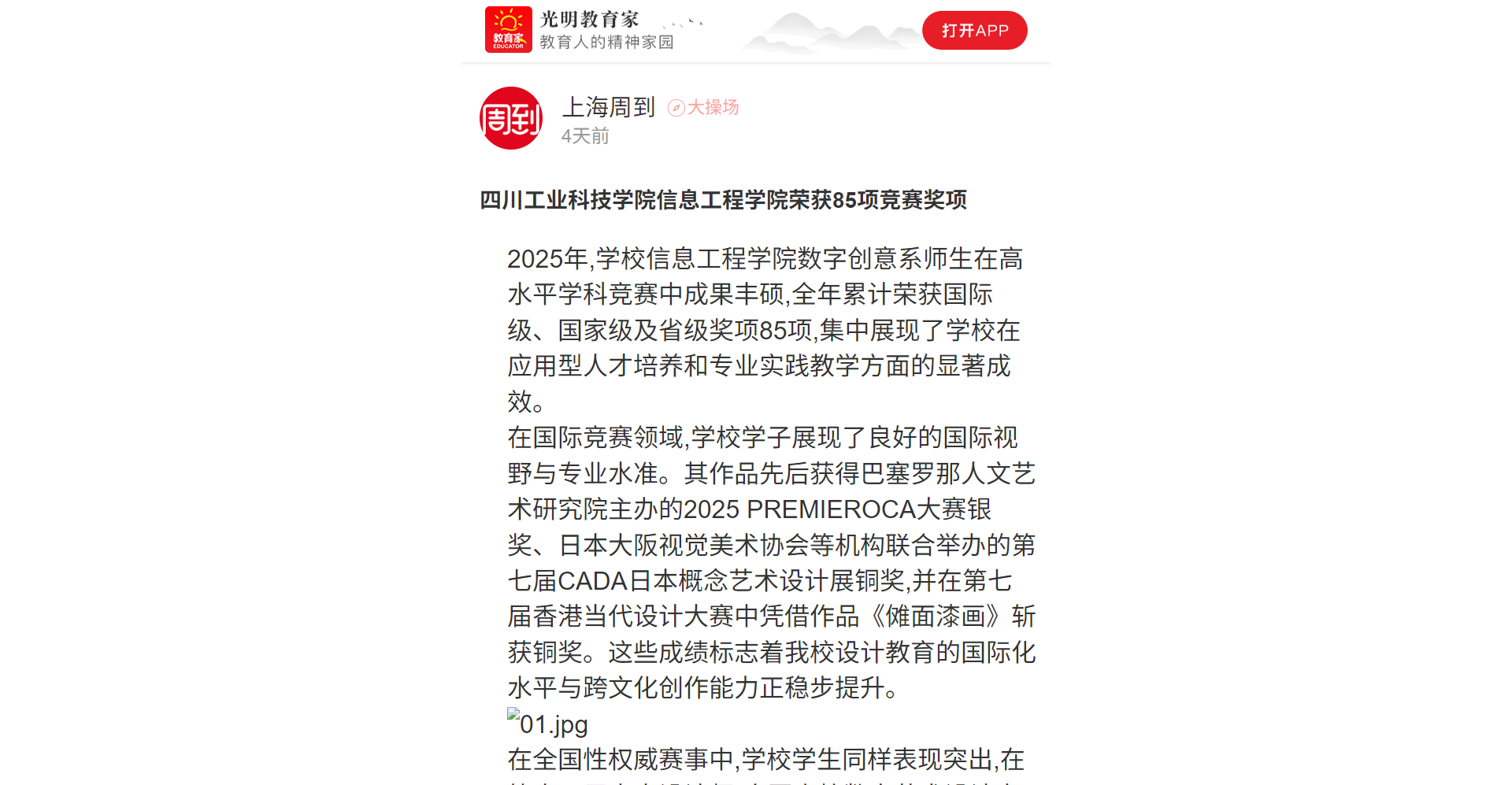 在省级竞赛层面,学校学子广泛参与并取得优异成绩,于四川省大学生广告艺术大赛、民族工艺美术创意设计大赛、环境设计大赛、乡村振兴创意设计大赛等各类专业赛事中荣获多项高级别奖项,展现了学校在服务地方文化建设、推动创意设计成果转化方面的积极贡献。