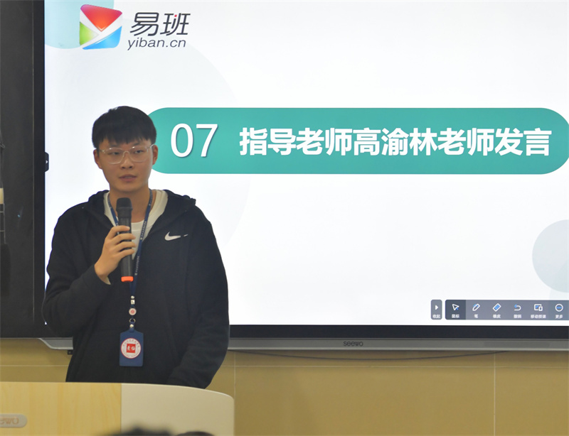 会议最后,指导老师高渝林总结发言。他对第五届全体易班成员的工作成果给予了充分肯定,并对新一届学生干部的到来表示热烈的欢迎。他指出,易班从成立以来走过了五年的风雨历程,已逐步探索构建起“一基两翼三新”网络育人模式。在过去的一年里,第五届易班学生工作站本着团结奋斗、务实高效、锐意创新的精神,充分发挥了易班“网络思政引领”“服务全校师生”的工作职能,较好地完成了上一学年的工作任务。同时他对第六届易班学生工作站全体成员提出三点要求。一是要切实加强学习,不断提高自身素质和技能水平,在注重自身素质提升的同时积极创造条件,采用各种方式提高知识技能和适应社会的必备能力,努力提高自己。二是要解放思想、改革创新、不断开拓工作新局面。要解放思想,创新工作,注重观念上的创新,制度上的创新,活动形式的创新,活动内容的创新。三是要以身作则,遵章守纪、团结同学共同进步,共同开拓学校易班更美好的明天。