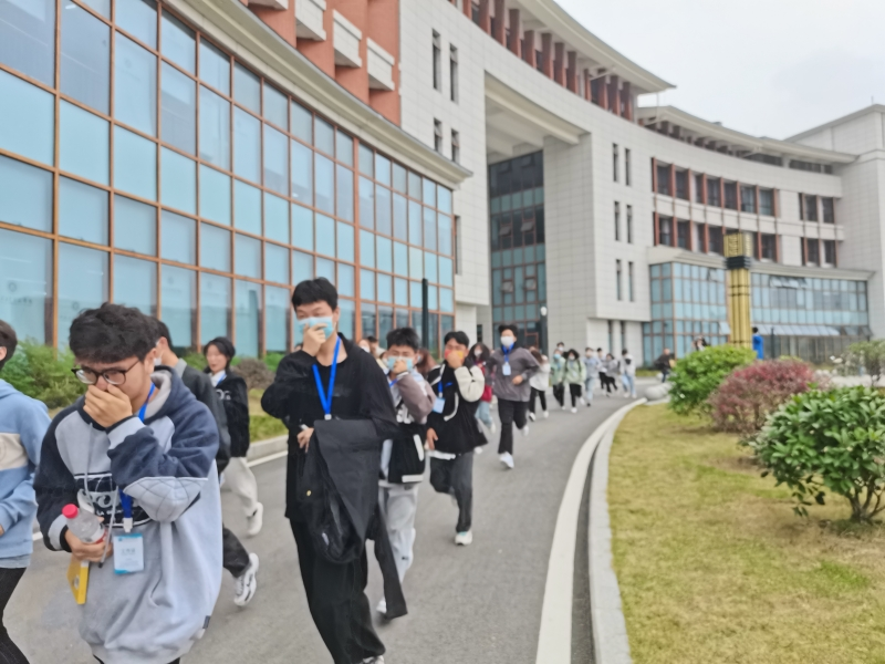 此次消防演练以模拟图书馆起火为例,警报声响起,在安全保卫处老师指挥下,同学们紧贴墙壁,用手捂住口鼻、弯腰、有序、安全地撤离,在3分钟之内按预定疏散路线安全撤离到指定地点。