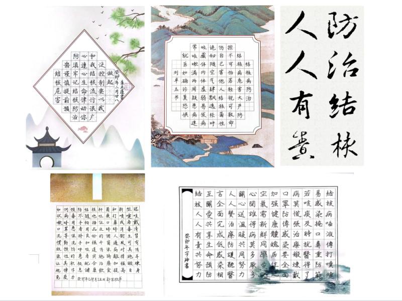 首先,由各班班长负责向本班同学传达比赛相关信息,鼓励有书法绘画特长的学生踊跃参与。活动中各班同学们,认真准备参赛作品,投入了极大的热情,积极发挥自己的特长,踊跃报名参加,且严格根据参赛要求进行作品投递。最后,由学院评委老师进行作品评选,评选结束后,对获奖学生实施表彰并将优秀作品通过学院微信公众号出一期推文向全院展出。本次展出的作品,内容丰富,形式多样,尤其是书法作品,或苍劲有力,或隽永飘逸,或清秀雅致,不仅彰显了我院学子深厚精湛的书法技艺,更加提高了大学生对结核病预防这一社会问题的关注。