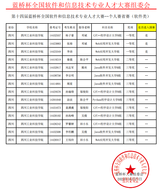 本次大赛由工业和信息化部人才交流中心主办,是国内权威性高、影响力大的大型IT类专业赛事,来自全国1600多所高校的16.5万余名选手共同参加了比赛。我校共有20名同学报名参加了软件类省赛,涉及Java、Python、C++、Web开发等多种编程语言和技术。经过激烈的角逐,学校共有14名同学获得了一等奖3项、二等奖1项、三等奖10项的优异成绩。