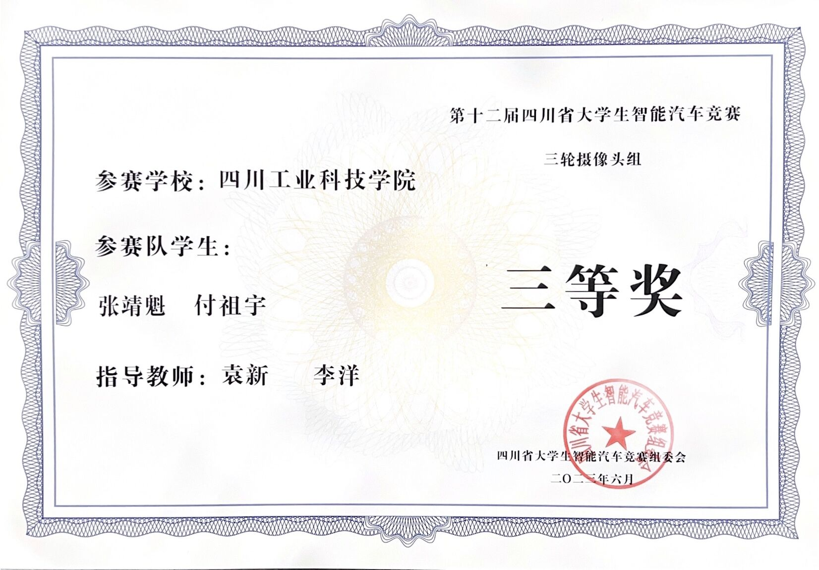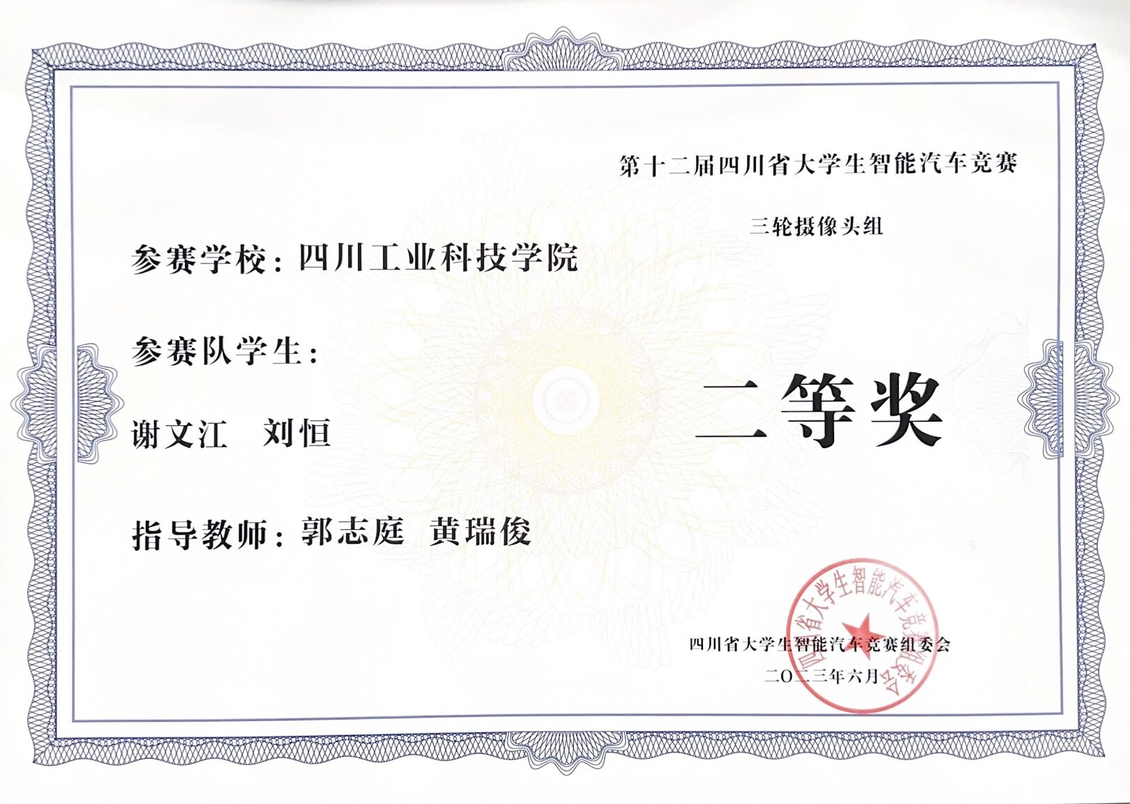 在三轮摄像头组中,由谢文江、刘恒组成的“夏夜之声”和张靖魁、付祖宇组成的“狂飙小分队”两个车队在预赛中分别跑出12.407秒和12.914秒的好成绩,战胜了四川大学、西南交通大学、西华大学等传统强队,在43支车队中分列第十二名和第十五名。其中“夏夜之声”车队突出重围进入第二天决赛,在决赛中再将名次提升两名,以第十名的成绩获得该组别二等奖,“狂飙小分队”车队以第十五名的成绩获得三等奖。