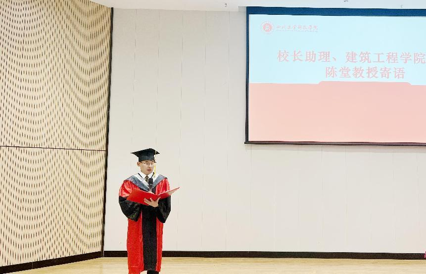 校长助理、学院院长陈堂为2023届毕业生送上临别寄语和真挚祝福。他首先向获得省级优秀毕业生以及顺利毕业的同学表示热烈的祝贺,并寄语全体毕业生:一是行者方致远,奋斗路正长,致力成为有责任、有担当、肯奋斗的新时代有为青年;二是面对未来,要有泰山压顶腰不弯的坚韧和敢于直面的勇气;三是未来的道路上互相帮助,勿忘师生谊,珍惜同窗情。
