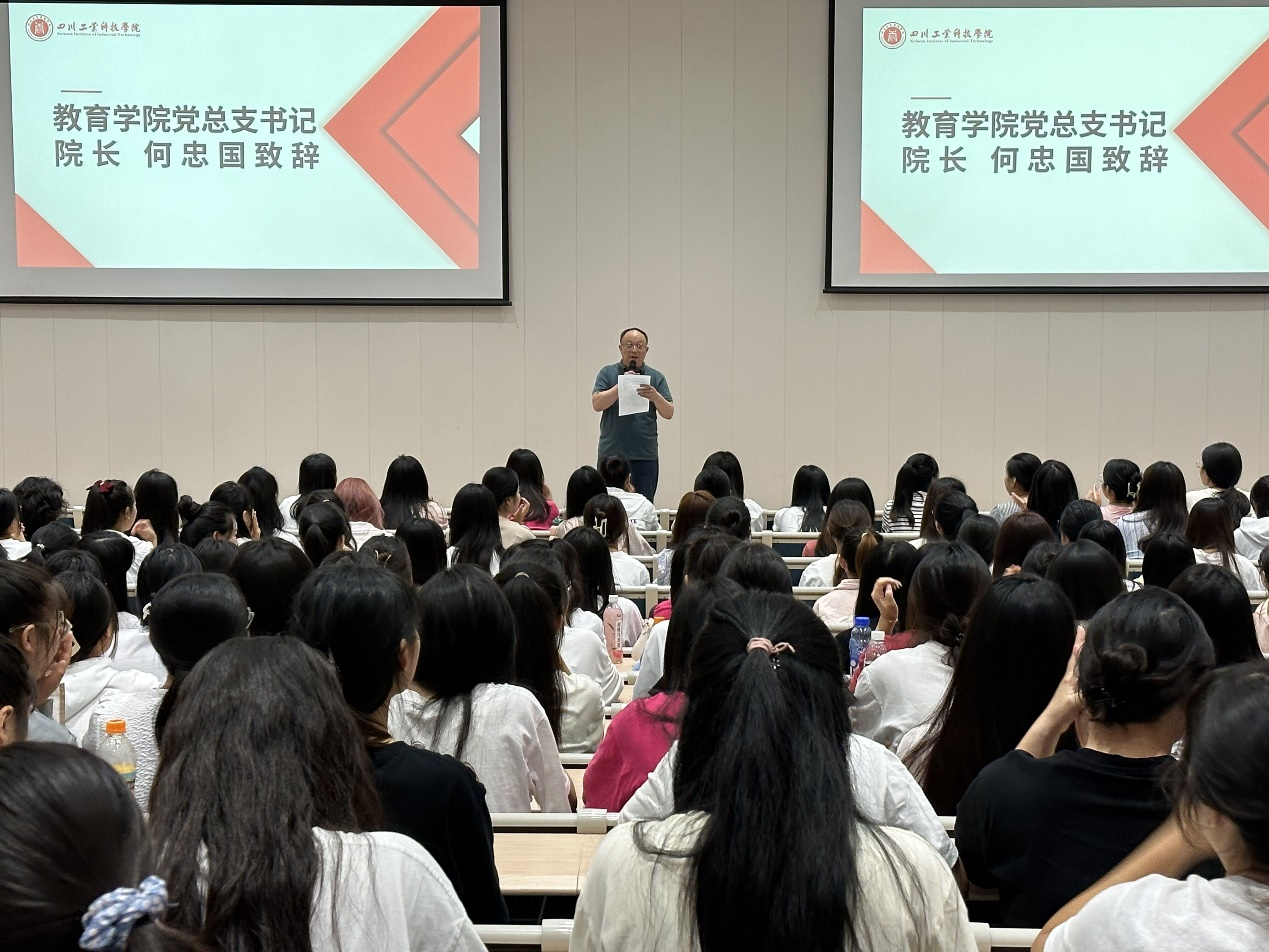 临近会议,同学们早早地到达开会地点,并按照规定区域就座。首先,介绍教育学院的领导干部,并由党总书记何忠国院长致欢迎辞,详细地介绍了教育学院的组成、办学理念和教育体系。