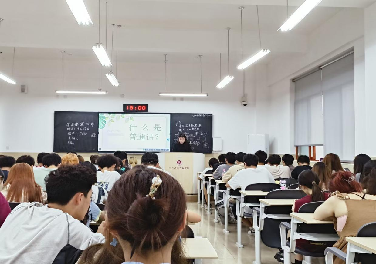 学院通过主题班会教育的形式,以小组活动、知识宣传、视频分享等方式开展主题教育,学生更直观了解学习推广普通话的重要性,并通过向同学提问等方式来宣传、答疑,最后达到教育的目的,养成良好的运用语言习惯。并以推普周活动为主旋律,以人人都讲普通话、时时都写规范为落脚点,紧紧围绕“推广普通话,奋进新征程”纵深推进推广普通话工作。