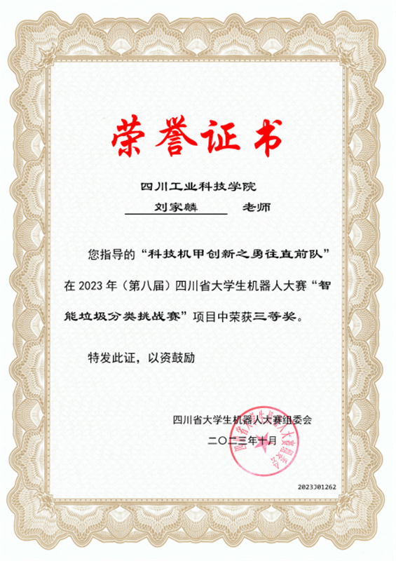 近日,由四川省教育厅主办、西南石油大学承办的2023年(第八届)四川省大学生机器人大赛落下帷幕,本次比赛学校派智能制造与车辆工程学院3支参赛队伍,由刘家麟老师指导的科技机甲创新之勇往直前队和姚柳老师指导的科技机甲创新队荣获“智能垃圾分类挑战赛”三等奖,由高强老师指导的超越队荣获“智能复合机器人技术应用比赛”优胜奖。
