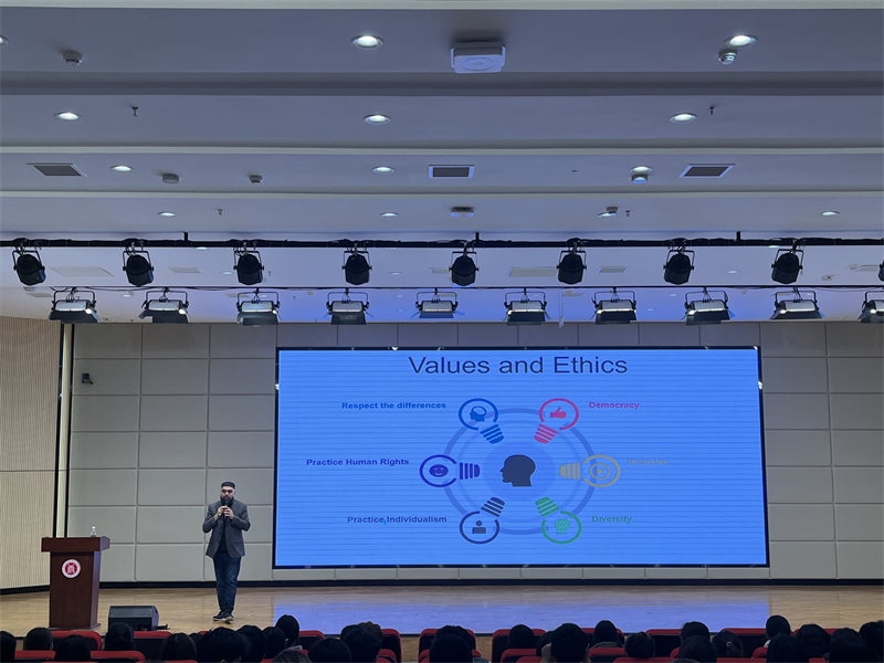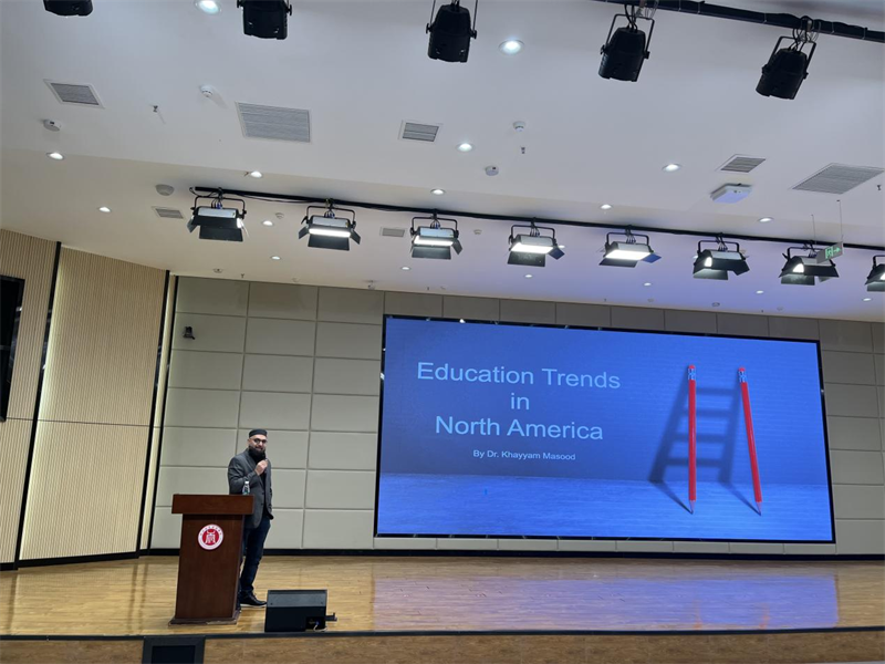 11月13日下午,由国际交流与合作部主办的“中外语言文化交流月”系列讲座第一场《北美高等教育》在龑江C区报告厅举行。活动邀请了加拿大AOL职业学院国际项目主任KHAYYAM MASOOD卡亚姆博士莅临讲座。国际交流与合作部全体教师和200余名学生共同聆听了讲座。讲座由杨宇婷老师主持。