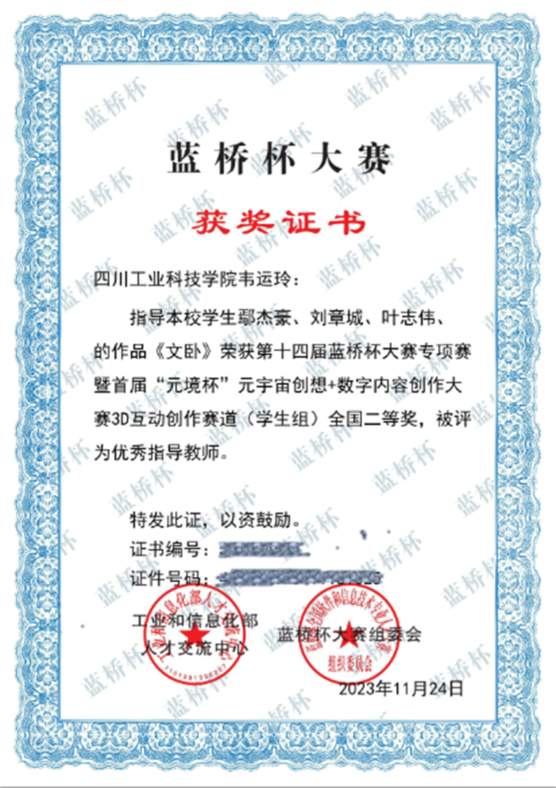由工业和信息化部人才交流中心和重庆市璧山区政府联合主办的第十四届蓝桥杯大赛专项赛暨首届“元境杯”元宇宙创想+数字内容创作大赛评审结果公布,电子信息与计算机工程学院韦运玲老师指导的鄢杰豪、刘章城、叶志伟3位同学的作品《文卧》荣获3D互动创作赛道(学生组)全国二等奖,韦运玲被评为优秀指导教师。