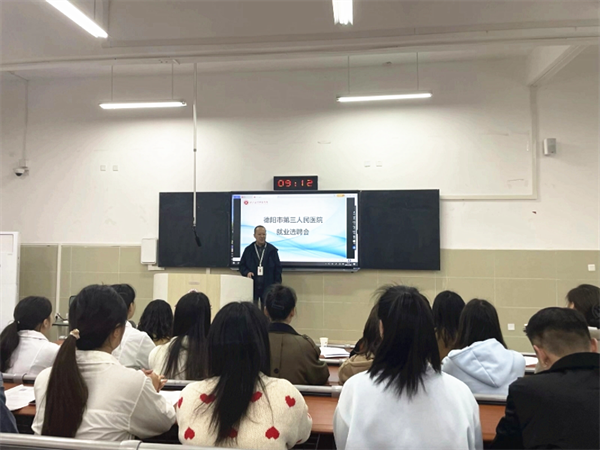 德阳市第三人民医院党总支专职副书记魏剑简要介绍了医院的发展沿革、医院文化和用人需求,希望双方能够进一步做细做实校企合作项目,打造产学共赢、协同育人、社会服务的合作典范。