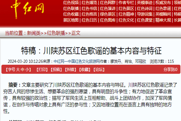 西南交通大学希望学院廖发丹、肖怡、邓冠欣撰写的文章《川陕苏区红色歌谣的基本内容与特征》被中红网以特稿转载,文章把川陕苏区红色歌谣的基本内容概况为苦难生活太悲催、革命烈焰燃川陕、政治宣传拥护党和军民一家情谊长,该研究对于川陕苏区红色歌谣的研究有重要意义。