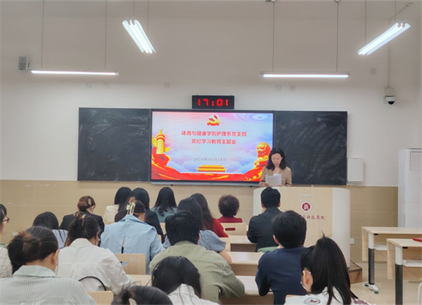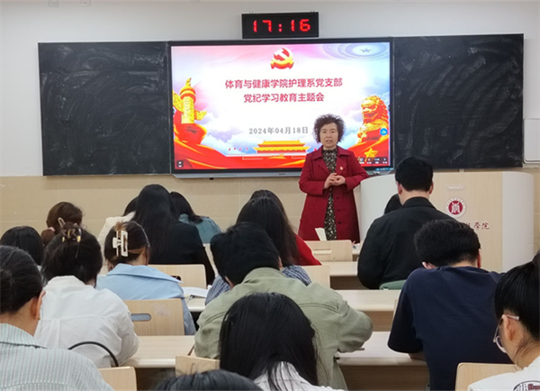 4月18日,体育与健康学院在龑江学村B201教室召开党纪学习教育动员会,护理系全体教师党员共计30余人参加本次会议。