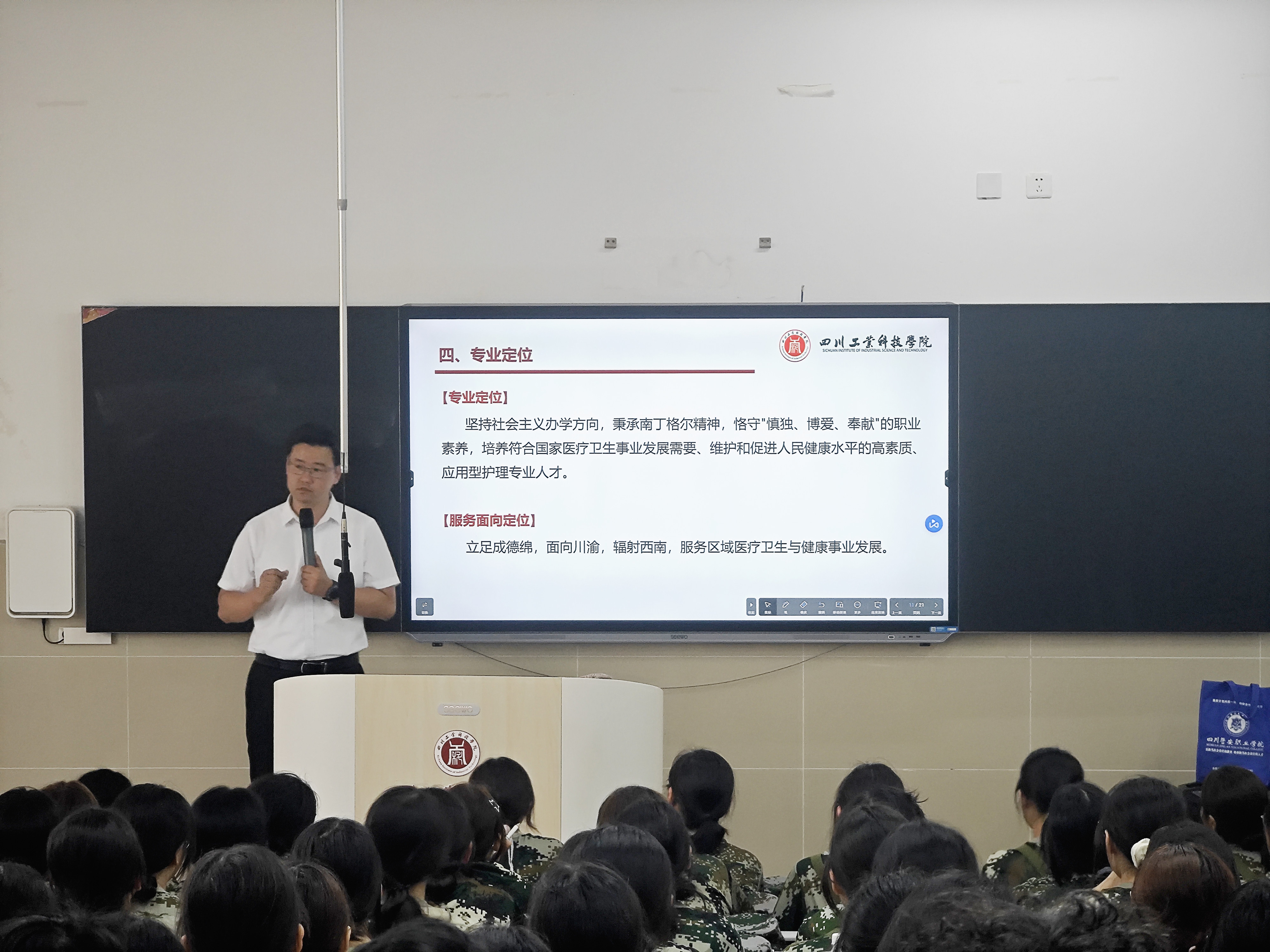 在专业教育环节,杨橙通过图文并茂的演示,系统介绍了护理学专业建设情况和2025级本科人才培养方案,从学院发展、专业定位、师资结构、核心课程与实践教学体系等方面进行了全面解读。护理系负责人白雪详细讲解了专业学科架构、课程体系及学业规划路径,引导学生明确学习目标,做好时间管理,为未来临床实践与职业发展打基础。