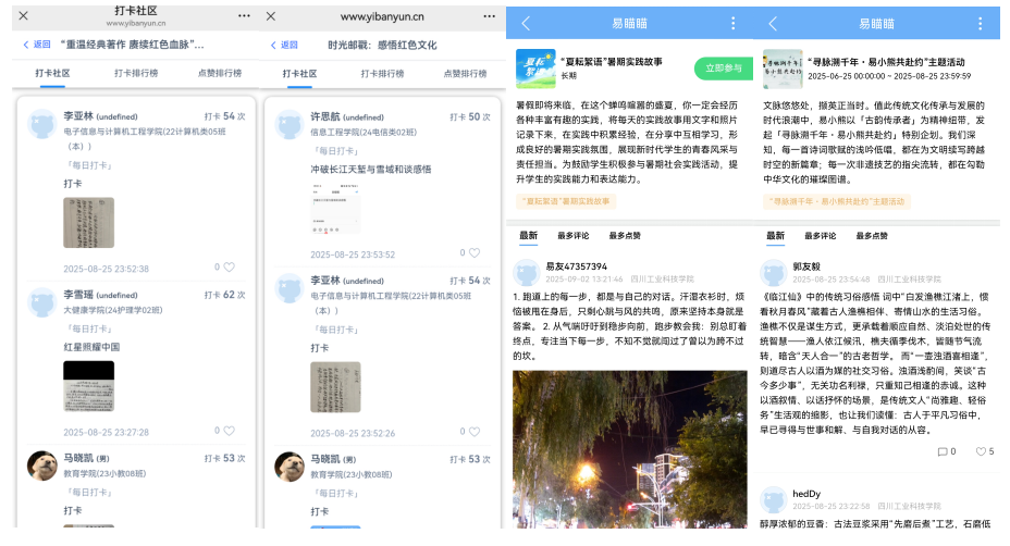 学校易班巧妙运用文化载体,激活育人效能,通过“寻脉溯千年·易小熊共赴约”打卡活动,引导学生深入探索中华优秀传统文化,在诗词、非遗的鉴赏与实践中增强文化自信与民族认同;开展“重温经典著作 赓续红色血脉”与“时光邮戳:感悟红色文化”主题活动,带领学生重温红色记忆,在跨越时空的对话中深刻感悟革命精神的时代价值。这一系列文化活动,以润物无声的方式实现了对学生的精神滋养和价值塑造,展现了文化育人独特的亲和力与感染力。