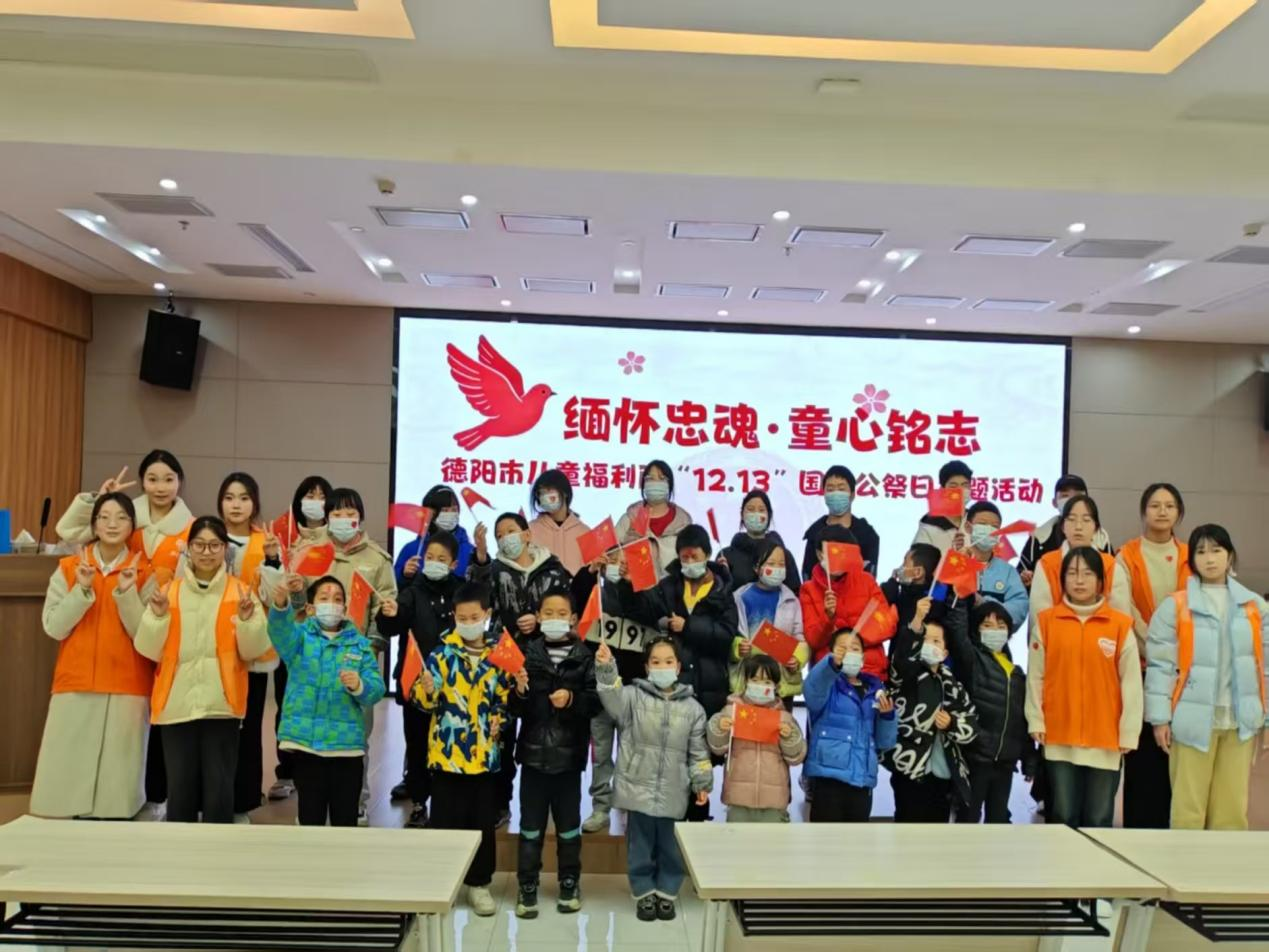 12月13日,在第八个南京大屠杀死难者国家公祭日到来之际,学校9名大学生志愿者在刘琴老师的带领下,走进德阳市儿童福利院,与院内25名儿童共同参与了由德阳市儿童福利院主办、德阳市同心社会工作服务中心承办的“缅怀忠魂·童心铭志”国家公祭日主题教育活动。