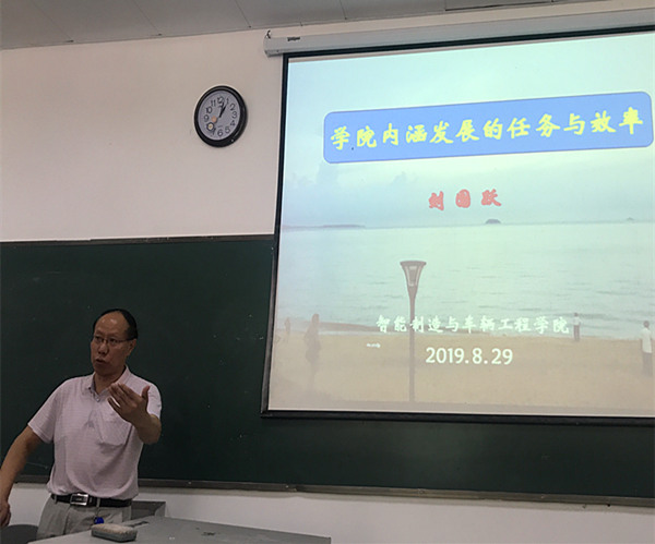 接着,院长刘国跃教授作了题为“智能学院内涵发展的任务和效率”的专题报告,以高等教育的职能、川工科人才培养目标定位、智能学院专业人才培养目标、智能学院发展的八大目标等为主线,从领导班子大局全局安全稳定和谐发展意识及运行效率、各管理团队的发展意识责任意识协作意识质量意识及运行效率、科研和教学团队在服务行业企业、反哺教学、提升培养质量等方面能力重要作用途径效果、学工队伍的理论政策水平工作能力与艺术工作时机工作效果、教职工的岗位职责理解学校发展下的个人成长等五个方面进行了较深入的讲述。