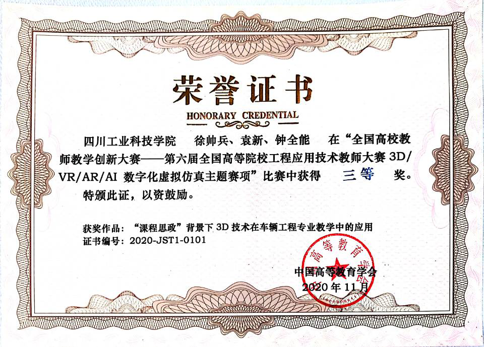 本届大赛3D/VR/AR/AI数字化虚拟仿真主题赛项共有240项作品进入全国总决赛,根据评审专家组的评审结果,共有96项作品获奖。经过激烈的比赛角逐,智能制造与车辆工程学院“智能制造”团队教师徐帅兵、袁新、钟全能的项目《“课程思政”背景下3D技术在车辆工程专业教学中的应用》在T1赛项中荣获大赛三等奖。在大赛中与多所名牌大学同台竞技,充分展示了我院教师扎实的基础知识、较强的实践操作与应用能力、良好的创新意识。