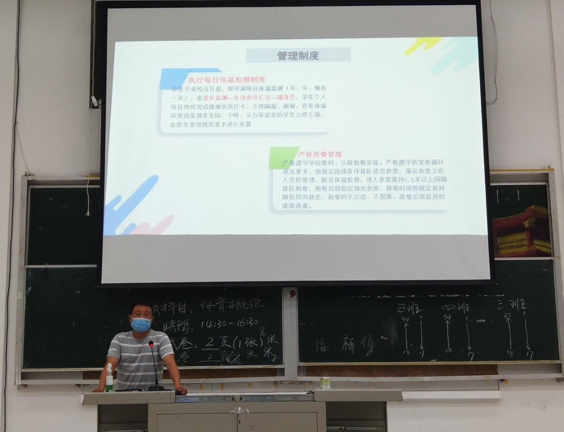 晚上,党支部副书记魏天强老师在阶梯教室为到校学生进行了开学第一课。课堂上重点强调:一、返校后制度管理。 二、在校时注意事项。其主要内容:1、管理制度又细分为四小点校园封闭管理、宿舍封闭管理、每日体温检测、严格用餐管理 2、在校期间做到“四不”不随地吐痰、不乱丢垃圾、不聚集闲聊、不追逐打闹。公共场所佩戴口罩,废弃口罩必须放入专用垃圾箱。