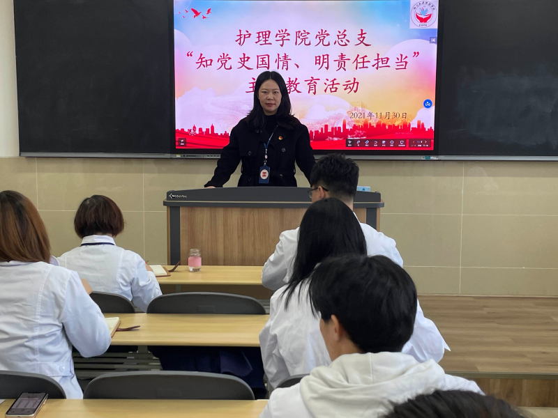 11月30日,为深入学习贯彻习近平总书记在十九届六中全会上的重要讲话精神,大力弘扬“勿忘昨天的苦难辉煌,无愧今天的使命担当,不负明天的伟大梦想,以史为鉴、开创未来”,进一步坚定“四个自信”,护理学院党总支在东区教学楼10栋504教室,开展“知党史国情、明责任担当”主题教育活动,会议由党总支副书记李双晶主持,学院全体老师、党员和入党积极分子,共计30余人参加会议。