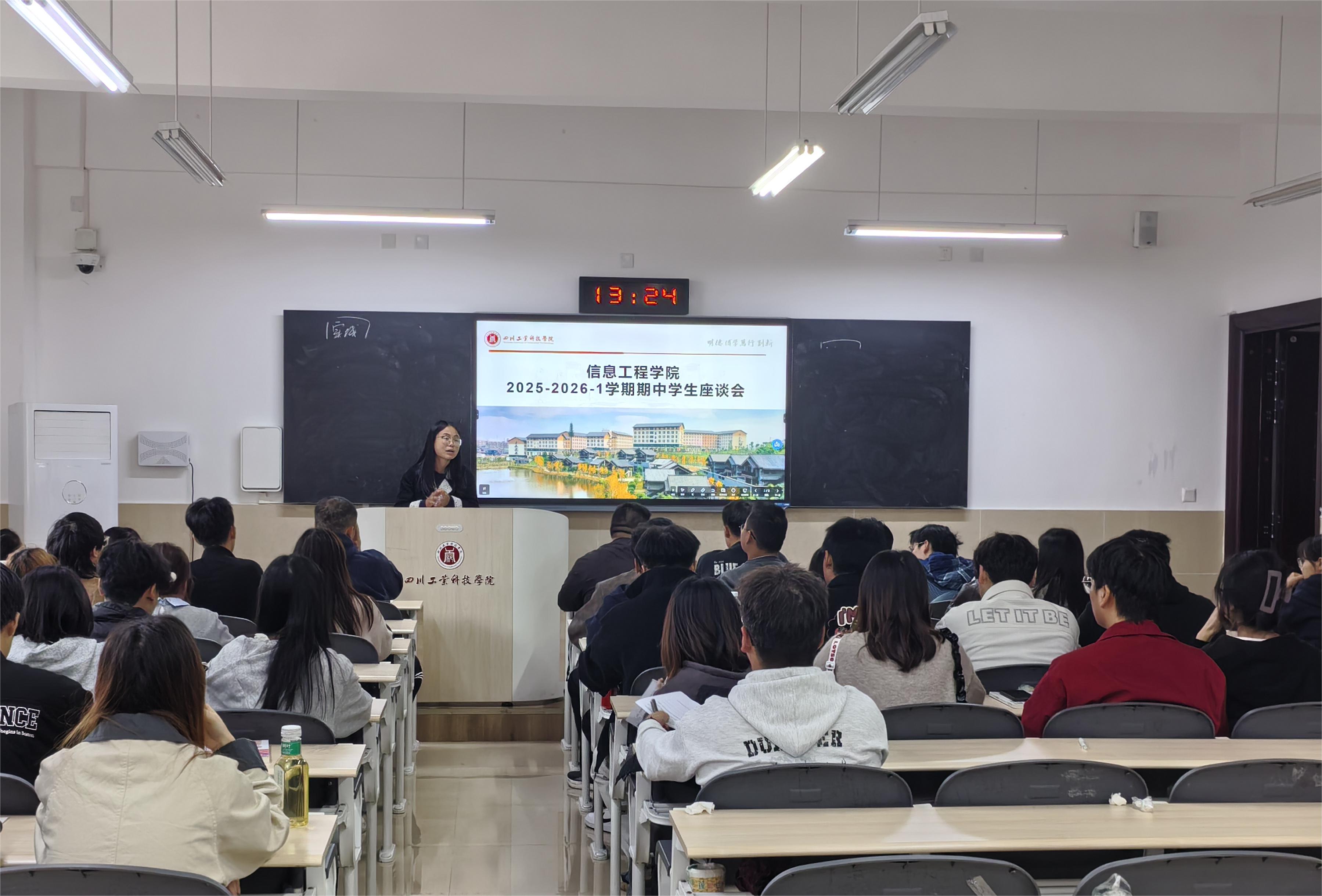 10月22日,信息工程学院在龑江C412组织开展2025-2026-1学期期中师生座谈会。会议由学院教学办副主任张丹主持,教学副院长柯莉院长出席,共计50余名学生代表参会。