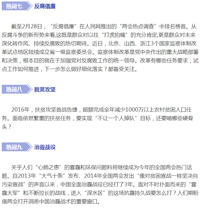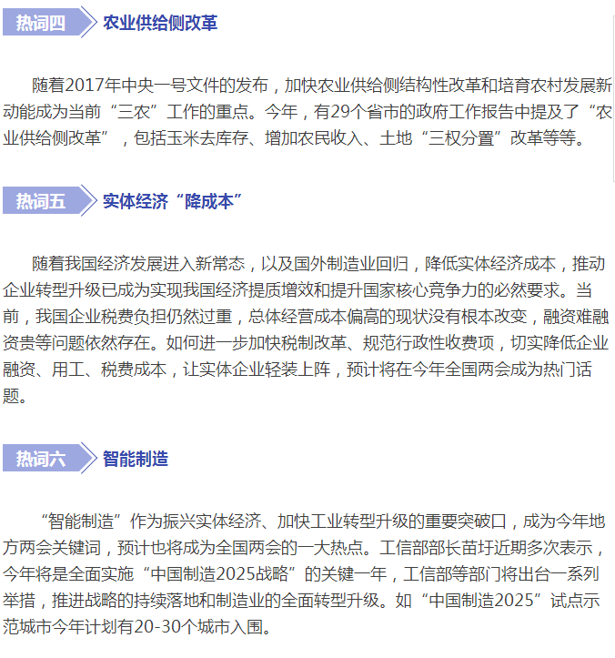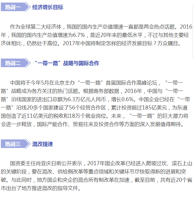 2017年是实施“十三五”规划的重要一年,是供给侧结构性改革的深化之年。全国两会“政经热词”涉及今年国家政经走向,所以备受关注。