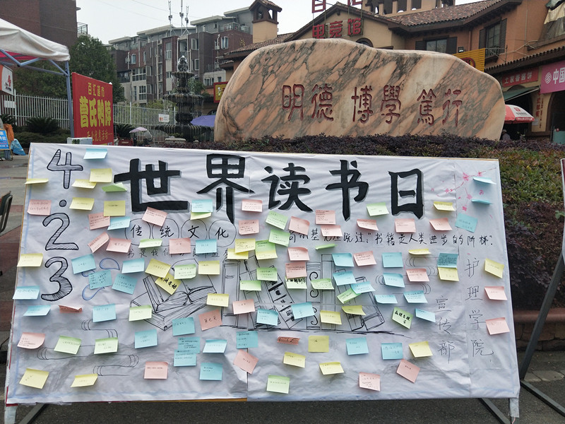 为培养学院学生的阅读兴趣,营造良好的校园阅读氛围,4月23日上午,在第24个“世界读书日”之际,护理学院团总支在学校百汇超市门口组织举行以 “书香伴我成长,阅读圆我梦想”为主题的读者签名活动。