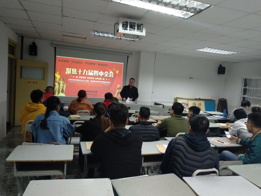11月13日,体育学院党支部全体老师们在绵竹校区244教室集中党的十九届四中全会精神,本次活动由体育学院执行院长雷耀方同志主持。