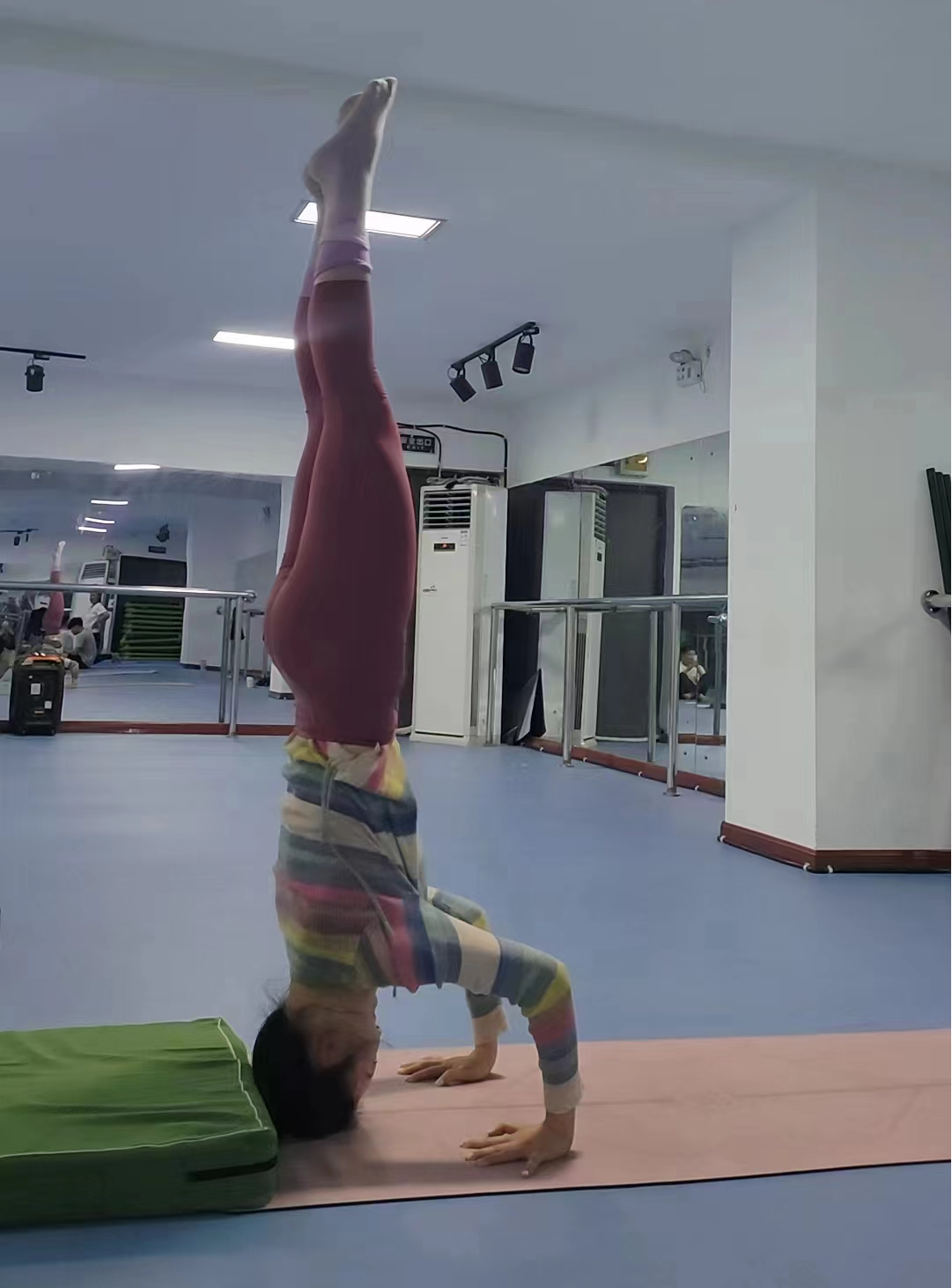 在训练现场,我们可以看到一位女学员正在做瑜伽的“头手倒立”姿势。她在瑜伽垫上,双手撑地,头朝下,双腿向上伸直,形成一个三角形。这个姿势不仅锻炼了身体的柔韧性,还挑战了学员的心理承受能力。